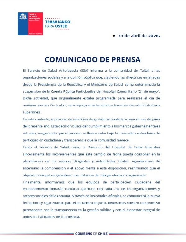En relación con la suspensión de la Cuenta Pública Participativa de nuestro Hospital, compartimos el comunicado de prensa oficial emanado desde el Servicio de Salud Antofagasta.