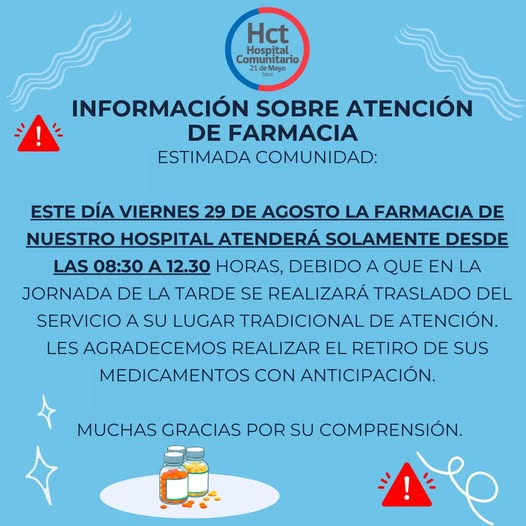 Estimada comunidad: informamos que este viernes 29 de agosto, nuestra Farmacia atenderรก solamente en su horario de la maรฑana, es decir, desde las 08:30 a 12:30. Esto, debido a que en la jornada de la tarde se realizarรก traslado del Servicio a su lugar tradicional de atenciรณn.