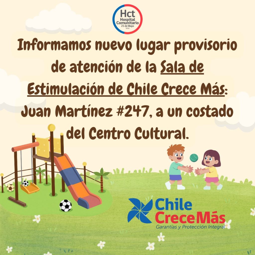 A nuestros usuarios y usuarias de la Sala de Estimulación de Chile Crece Más, les reforzamos la información acerca del cambio de lugar de atención.